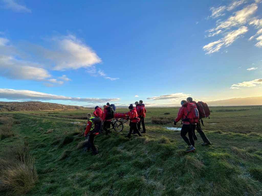 Team members were quickly on scene to attend to the lady who had sustained a lower leg injury. The Team stretchered our casualty about 1km along the marsh to the roadhead and she was then taken into hospital by the family.